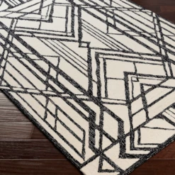This rug enlivens any space with its swirled dash design in white on a black ground.