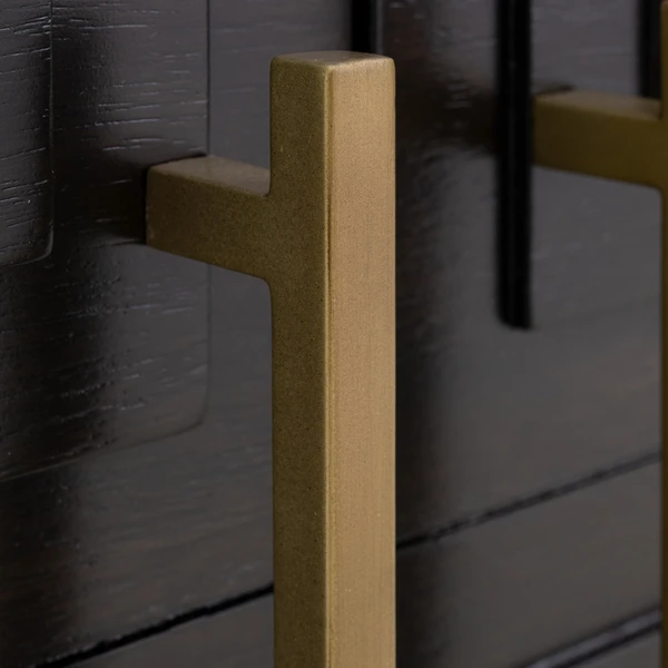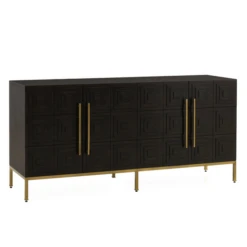 Sophisticated yet approachable, introducing the majestic Alon Media Console. Sculpted from acacia wood and features rustic brass legs. The brass accents and textured geometric details are reminiscent of the glamourous art deco style for that extra flare.
