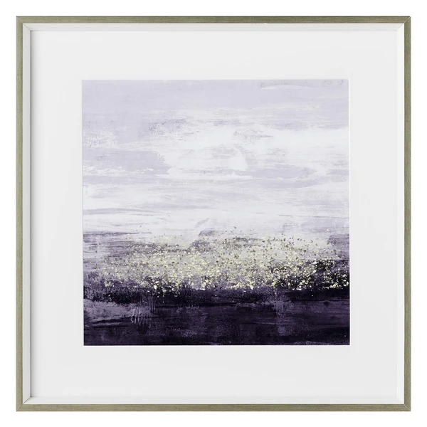 Composed with a hazy, ethereal quality, this print from artist Jennifer Goldberger is embellished with hand-applied mica flakes for a hint of sparkle. Set off with a white mat, this piece is displayed under glass in a white-and-silver frame.