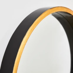 A standout addition to any space, gleaming gold trim accentuates the extra-deep, glossy black frame of this beveled mirror.
