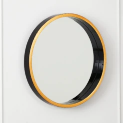 A standout addition to any space, gleaming gold trim accentuates the extra-deep, glossy black frame of this beveled mirror.