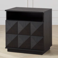A textural delight, this eye-catching nightstand is framed in kiln-dried hardwood and wrapped in rustic oak veneers with an expressive grain that beautifully highlights its faceted, dimensional design. Two push-latch drawers and an open shelf offer plenty of bedside storage.