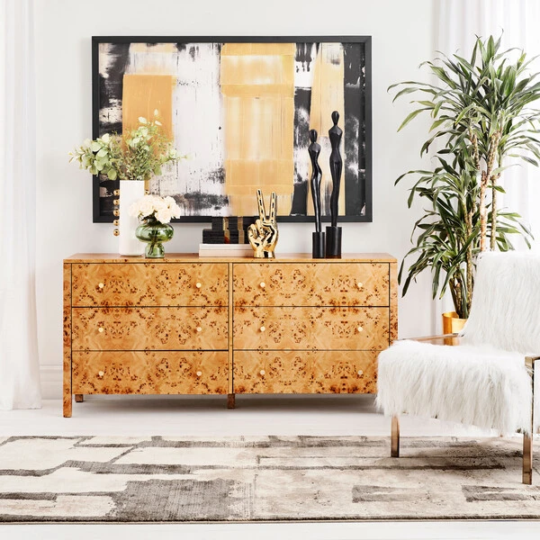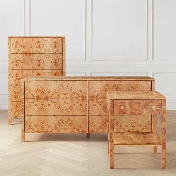 Our Brynn dresser makes a stunning focal point in the bedroom with its richly figured burl veneers and modern, clean-lined silhouette. A high-gloss finish and brass hardware complete this luxe design.