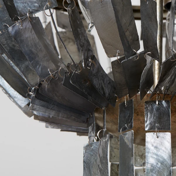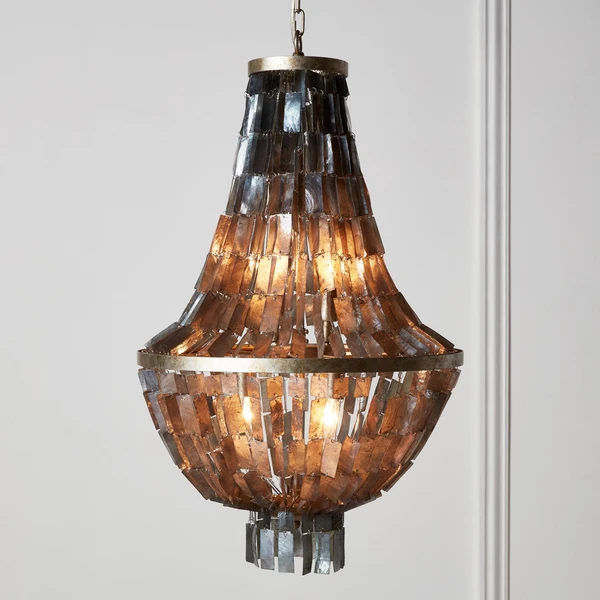 Black Mother of Pearl shell is elegantly draped over a champagne leafed metal frame creating the perfect chandelier for a sophisticated coastal space.