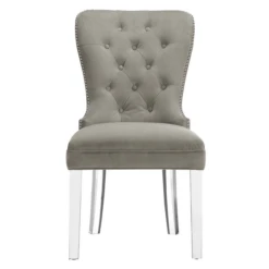 With its gentle curving silhouette, our sophisticated Charlotte Dining Chair effortlessly elevates the style of any room. Plush upholstery and hand-applied nail head details atop acrylic legs make our Charlotte Dining Chair both refined and versatile. A pull ring matching the nailheads adorns the back of each chair. Shown in Bella Velvet Dove with bright nickel nailheads.