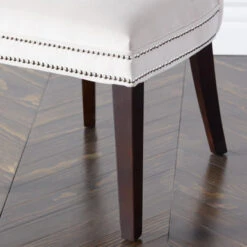 With its gentle curving silhouette, our sophisticated Charlotte Dining Chair effortlessly elevates the style of any room. Plush upholstery and hand-applied nail head details atop wooden legs make our Charlotte Dining Chair both refined and versatile. A pull ring matching the nailheads adorns the back of each chair. Shown in Bella Velvet Pearl with bright nickel nailheads.