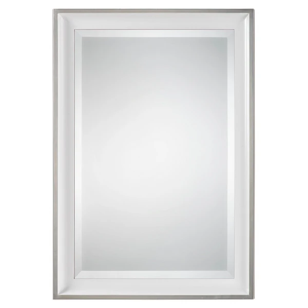 Indulge your wall with the contemporary cosmopolitan style of our Commencement Mirror. With a sloped wooden frame and glossy white finish, our mirror’s beautifully beveled border produces a glowing reflection. Silver leaf embellishment around the frame gives Commencement a glamorous edge.
