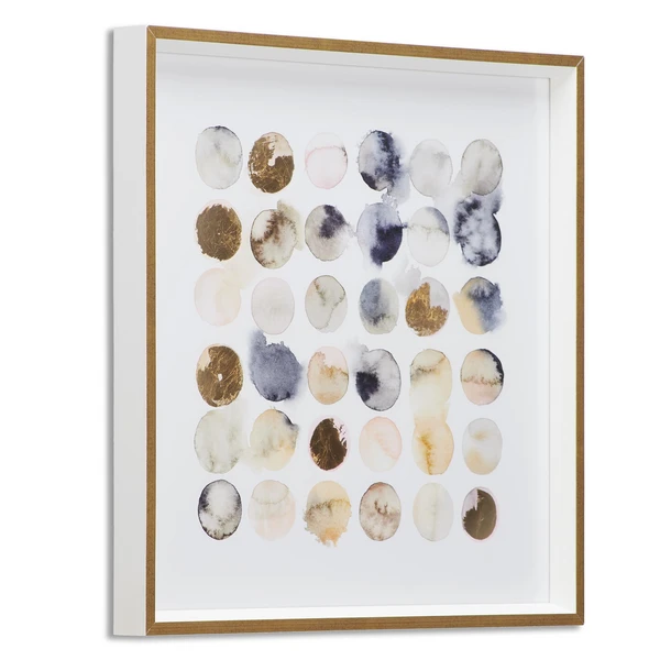- Giclee print on fine art paper with hand applied gold leaf accents. Set under glass in a solid wood frame with a gold and white finish.