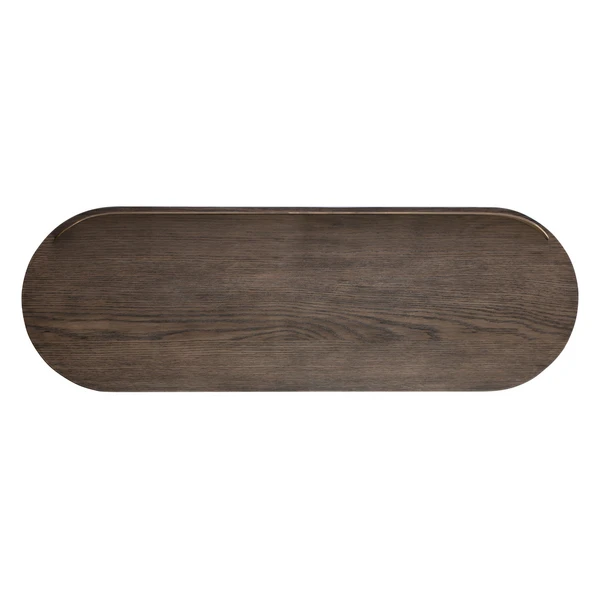 A sleek addition to the entryway or living room, this console immediately draws the eye with its oblong silhouette, brass backsplash, and dark espresso finish.