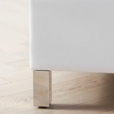 Channel tufting pared with an acrylic frame gives our Emory Bed a modern feel with glamourous touches. Accented with stainless steel corners and feet. Shown in Bella Velvet Grey.