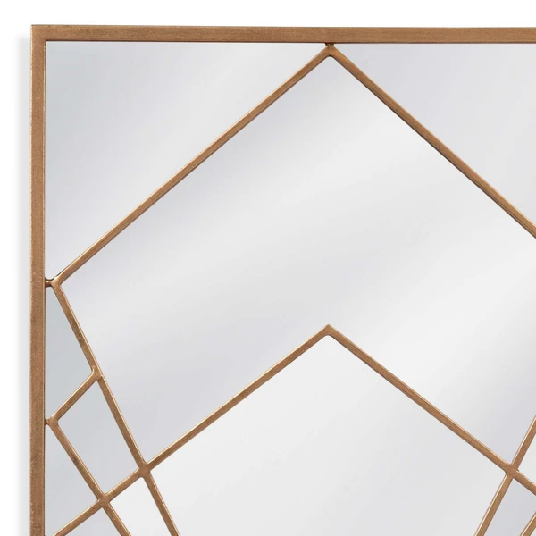 Our Finn Mirror features a thin metal frame finished in gold with gold triangular overlay design.