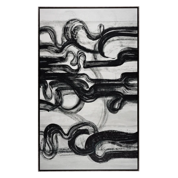 In The Groove combines black and white tones to create a futuristic yet simplistic piece of art. The fluidity of this piece is enhanced with the use of elongated brush strokes in a swirl like pattern that create a unique composition of black on white.
