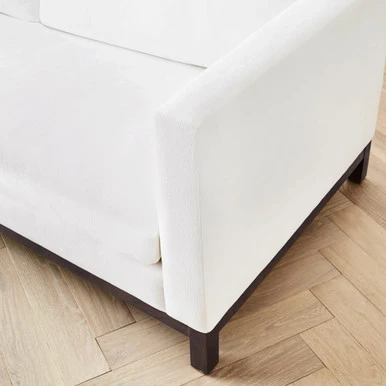 Showcasing clean lines, neatly tailored upholstery, and an exposed wood base, our James sofa delivers a sophisticated, modern look to any sitting area. Made in the USA. Shown in Kenley Chenille Snow.