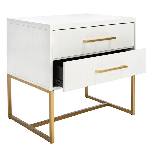 Alive with natural beauty and a dynamic modern pattern, this contemporary nightstand brings style to any bedroom. Designed with a white finish and substantial brass metal hardware and legs.