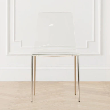 Sleek and modern, this pair of dining chairs flaunt beautifully contoured clear acrylic seats atop clean-lined steel frames finished in brushed nickel.