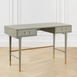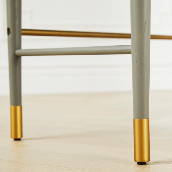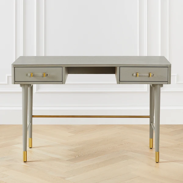 This midcentury-style desk smoothly transforms retro-chic style into sophisticated contemporary decor. Its open geometric frame of sleek grey-finished wood gives any room a rich, airy ambiance, while the brass-finished stainless steel caps and accents complete the look for a touch of glamour.