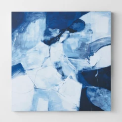Shades of blue are celebrated in the series entitled Light Taming. These dynamic abstract pieces are perfectly square and engage the eye in a remarkable way. Created with giclee on canvas, each piece has an image brush gel finish. Hand-painted strokes of the original image are applied with a brush. 1 of 2 in a series.