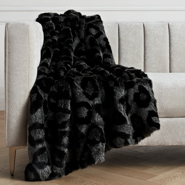 Perfectly plush, this oversize faux-fur throw brings comfort as well as style to any space with its long, fluffy pile, leopard-spot design, and equally soft velvet on the reverse.