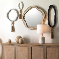 Inspired by the East, this set of three decorative hangings will add instant sophistication to any decor. These three organic, free-form resin rings will draw the eye to the expertly hand-knotted sisal rope and single natural wood bead. Soothing shades of blue, gray, and white create a feeling of calm. Generously sized, each piece is artisan crafted and each set is unique. The finish, wood grain, and exact measurements will vary.