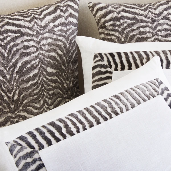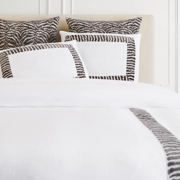 Welcome to the jungle! If you covet animal prints in your decor, the Hasina Bedding Collection is perfect for you. Grey animal print forms a border on the ivory duvet and shams. Slubbed linen adds texture to the fronts of each piece.