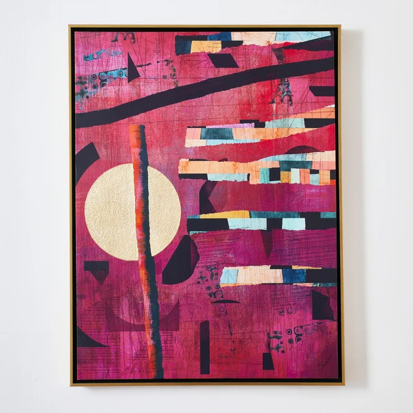 Printed on canvas with hand-applied impasto gold embellishments and set in a gold frame, this striking work from Nikki Chu lends a modern mood and vibrant color to the wall.