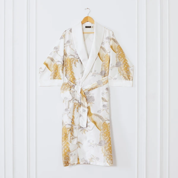 Lounge in style with this silky soft robe-and-eye-mask set, artfully adorned with blooming branches and perched peacocks.