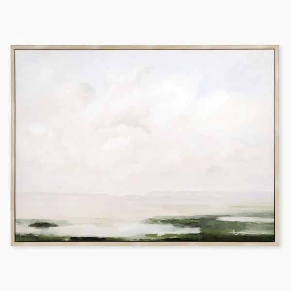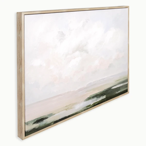 Pink Horizon is a gallery-wrapped canvas with hand-applied pallet knife embellishment set in a blonde wood tone floater frame.