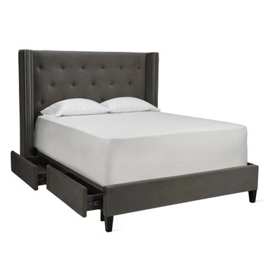 Our Porter collection elevates the comforts and function of your bedroom. The clean lines and modern details make a statement in the room while the four upholstered storage drawers lend a hand for your storage needs. Shown in Bella Velvet Otter with bright nickel nailheads.
