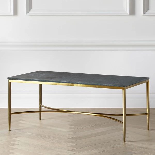 An ideal centerpiece for the modern living room, this coffee table’s sculptural steel frame is finished in brushed gold and supports an expressive green marble top.