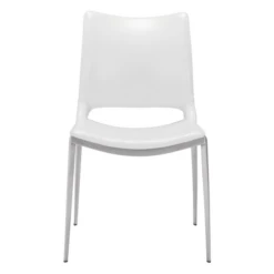 This sleek armless dining chair lets you sit back and relax in comfort. Its perfectly pitched back cradles you, while the sturdy steel frame supports your every move. The white faux leather seat is beautifully stitched adding a designer detail to a simple profile. Set of 2