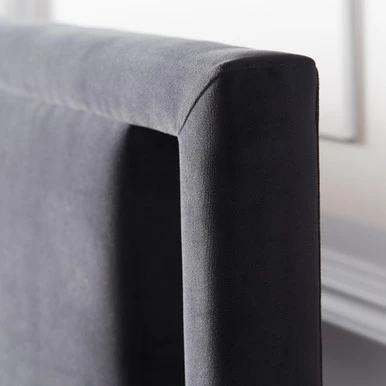 Framed in sturdy kiln-dried hardwood, our Roya platform bed boasts an elegant, clean-lined silhouette, neatly tailored upholstery, and side cutouts on the headboard for added impact and drama. Shown in Bella Velvet Black.