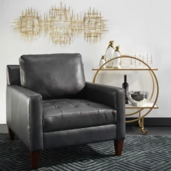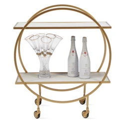 Let our Deco-inspired Russo Bar Cart make the rounds at your next soirée. Set atop rolling casters with a metallic gold frame, white faux leather trays will keep your treats in place. Tea and cakes, wine and cheese, or jazz it up with your modern take on a Gin Rickey.