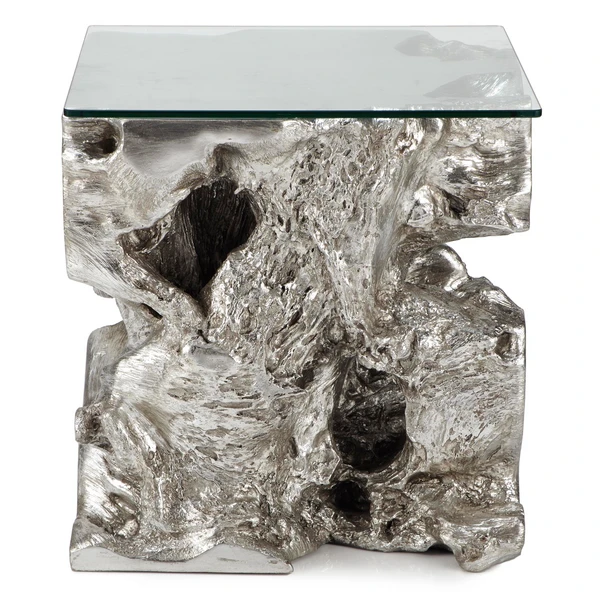 Invite natural-looking elements into your home with our luminescent Sequoia End Table. Carefully cast from the roots of an Acacia tree, this table brings sculptural detailing to its surrounding décor. Molded out of resin in a multi-step process, our Sequoia End Table is finished in silver leafing, giving the table base a subtle luster. A 3/8″ thick glass table top completes the table, allowing for easy viewing of the stunning organic display below.