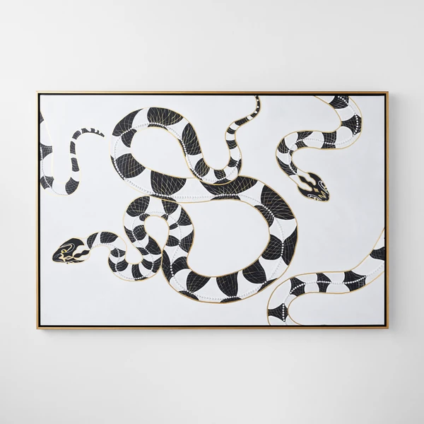 Like Eve, you’ll be tempted by the serpent in this painting. The monochromatic image is easily incorporated into your decor, and it makes a stunning visual statement. This piece is created by printing the image on canvas with “diamond dust” glitter and hand-embellishing texture on it. Finished with an image brush gel, this piece is set in a gold floater frame.