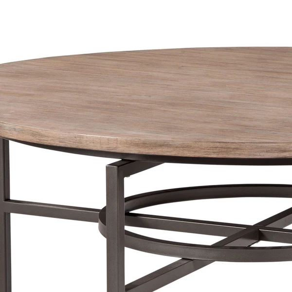 The Troy round dining table features birdseye maple wood veneer top with a steel base in a graphite finish.