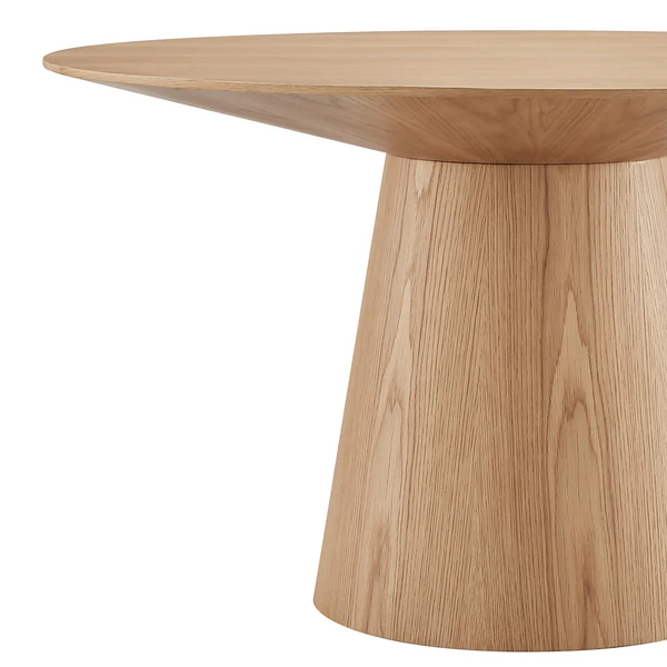Designed with a oak veneer finish and sculptural silhouette, this dining table lends cool, contemporary style to the dining room. Assembly required.