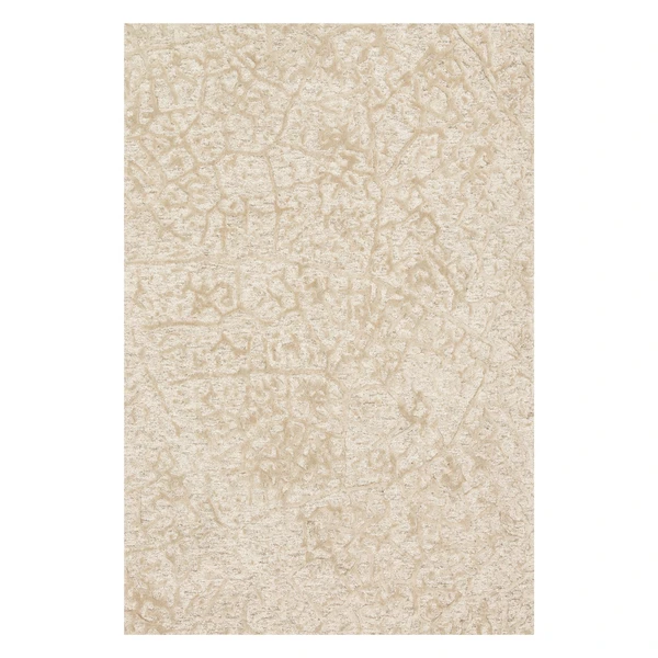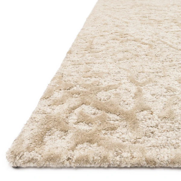 This striking rug contains high and low effects that are hand tufted with viscose and wool for a silky shine inspired by nature’s most textured landscapes.
