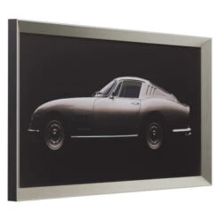 Ideal for adding a cool, retro vibe to any space, this photograph of a vintage Ferrari from Malcolm Sanders is reproduced on paper and displayed under glass in a silver frame with sleek black sides.