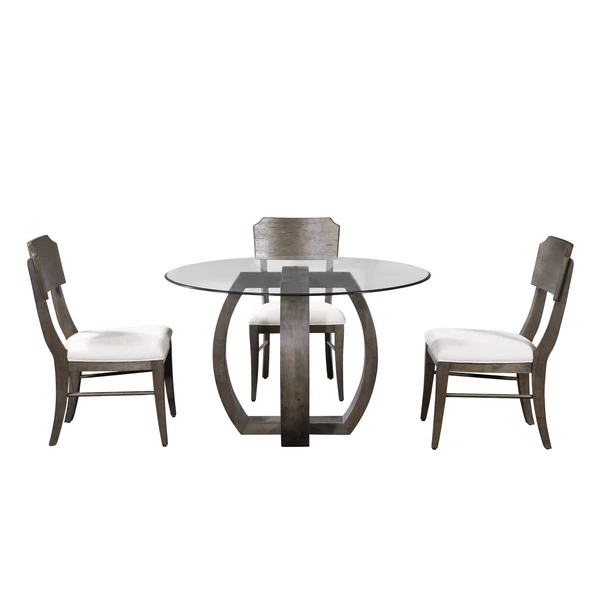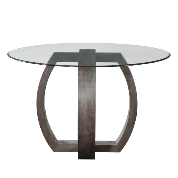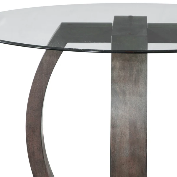 The Westley round dining table features a clear glass top and an intricate espresso finished wood base.