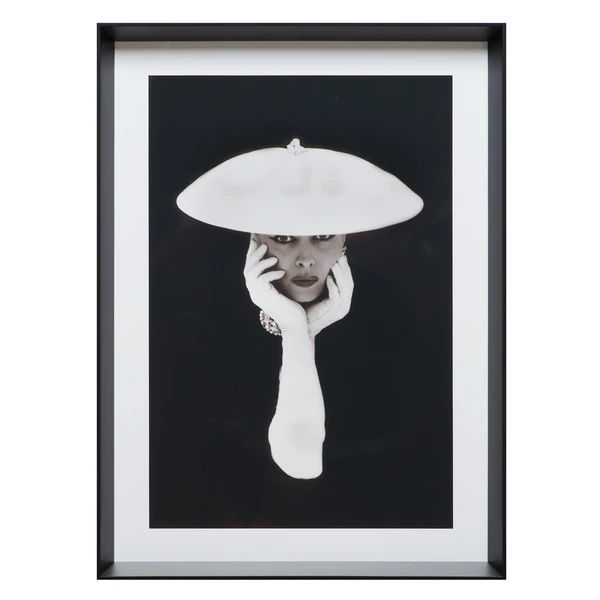 A glamorous portrait in black and white, this giclée print is displayed under glass in a matte black frame.